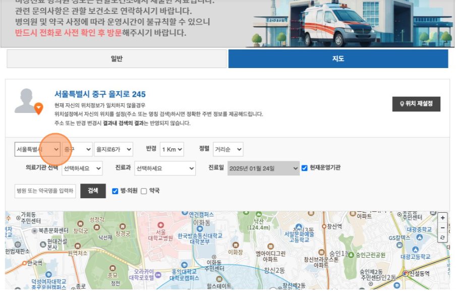 동까지 선택한 뒤 검색하면 가끔 근처 가까운 곳에 현재 운영하는 병원이나 약국이 없는 경우 검색 결과가 없다고 나올 수 있어요.